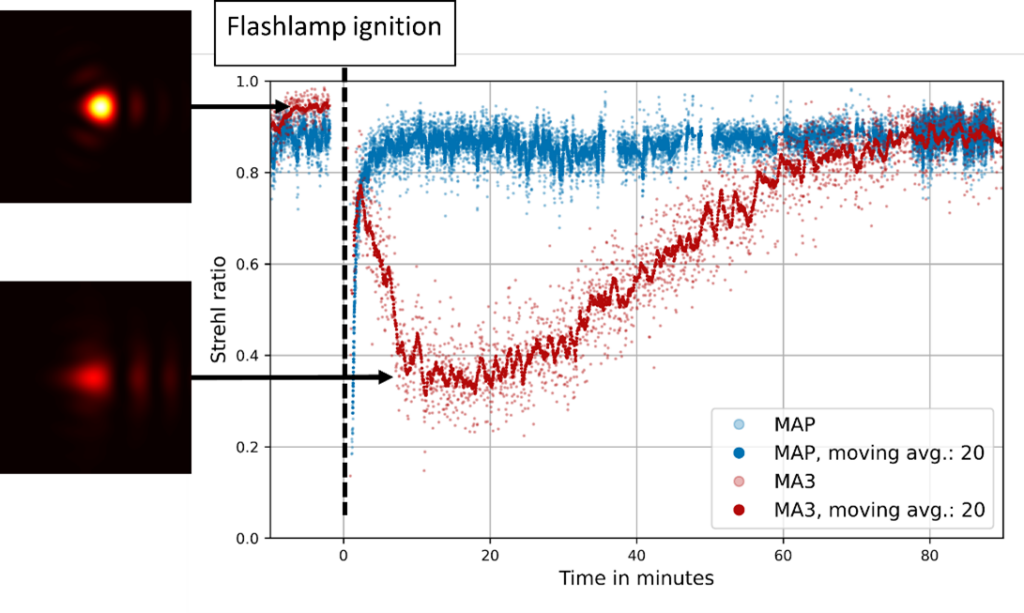• Real-time adaptive optics (RTAO) system at Apollon was finalized and first promising tests were performed.